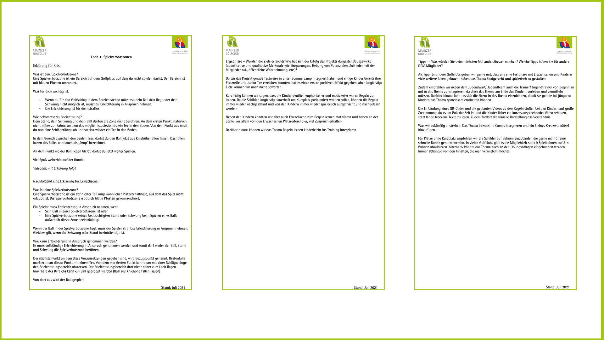Mainzer Golfclub GmbH & Co. KGkinderleicht Regeln lernen Um dem entgegenzuwirken haben wir auf dem Kurzplatz an jedem Loch eine andere Regel erklärt. Die Erklärung ist unkompliziert über einen QR-Code an dem jeweiligen Loch abrufbar und trifft somit gerade bei den Kindern den Puls der Zeit. Neben dem offiziellen Regeltext, ist auch eine kindgerechte Alternative mit dabei. So wird das Spielen auf dem "Platz" direkt mit dem Regel lernen kombiniert und die Spielerlaubnis wird schneller erlangt. |