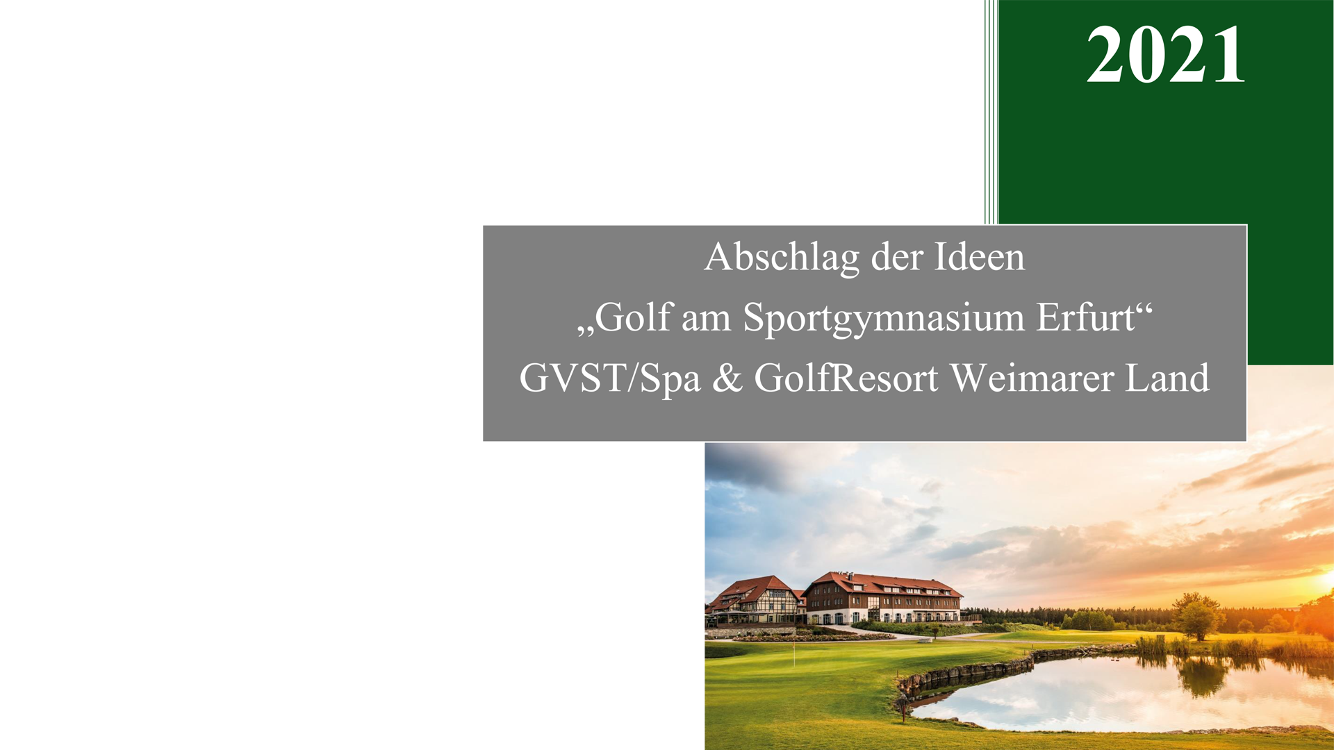 Spa & GolfResort Weimarer LandGolf am Sportgymnasium Erfurt Der Landesgolfverband Sachsen und Thüringen e.V. hat das Projekt Golf am Sportgymnasium Erfurt 2009 ins Leben gerufen. Seit dem Beginn des Projektes fördert der GVST das Projekt und entwickelt es stetig weiter. Eine neue Stufe der Entwicklung wurde im September 2020 mit der Vergabe des Trainingszentrums an das Spa & GolfResort Weimarer Land erreicht. |